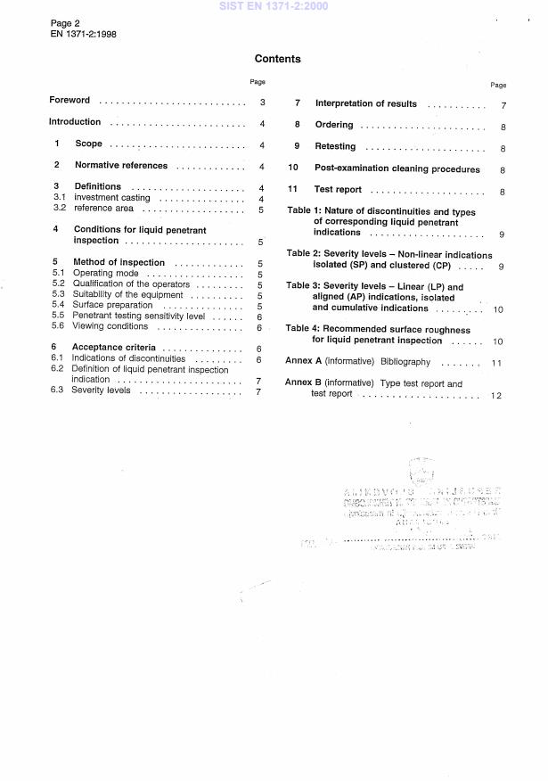 EN 1371-2:1998 is a standard published by the European Committee for Standardization (CEN). Its full title is "Founding - Liquid penetrant inspection - Part 2: Investment castings". This standard covers: This European standard specifies the application of liquid penetrant testing to all castings (except copper-tin and/or copper-tin-lead alloy castings, where copper is the major constituent) produced by investment casting for the general purposes. This standard does not apply to aerospace investment castings.