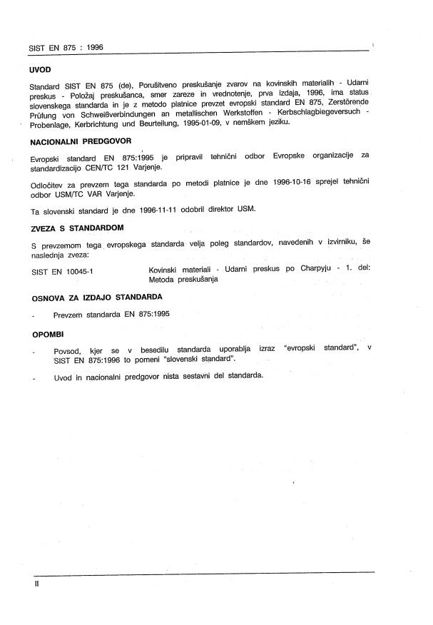 EN 875:1995 is a standard + national annex and/or foreword published by the European Committee for Standardization (CEN). Its full title is "Destructive tests on welds in metallic materials - Impact tests - Test specimen location, notch orientation and examination". This standard covers: This standard specifies mainly the method to be used when describing test specimen location and notch orientation for the testing and reporting of impact tests on welded butt joints. This standard applies to impact tests on metallic materials in all forms of a product made by any fusion welding process. It is used in addition to EN 10045-1 and includes test specimen denomination and additional reporting requirements.