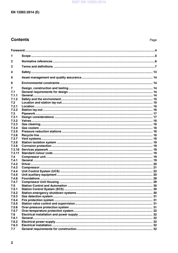 Key 1 compressor station 4 pig traps 2 distribution system 5 transmission line 3 metering and/or pressure limiting or regulation station 6 storage facility NOTE Parts indicated in frames by thick lines are within the scope of this European Standard (* part of pipeline but operated by SCS). Figure 1 — Schematic representation of compressor stations in the gas infrastructure 2 Normative references The following documents, in whole or in part, are normatively referenced in this document and are indispensable for its application. For dated references, only the edition cited applies. For undated references, the latest edition of the referenced document (including any amendments) applies. EN 1012-3, Compressors and vacuum pumps — Safety requirements — Part 3: Process compressors EN 1594, Gas infrastructure — Pipelines for maximum operating pressure over 16 bar — Functional requirements EN 12186, Gas supply systems — Gas pressure regulating stations for transmission and distribution — Functional requirements EN 12732, Gas infrastructure — Welding steel pipework — Functional requirements SIST EN 12583:2014