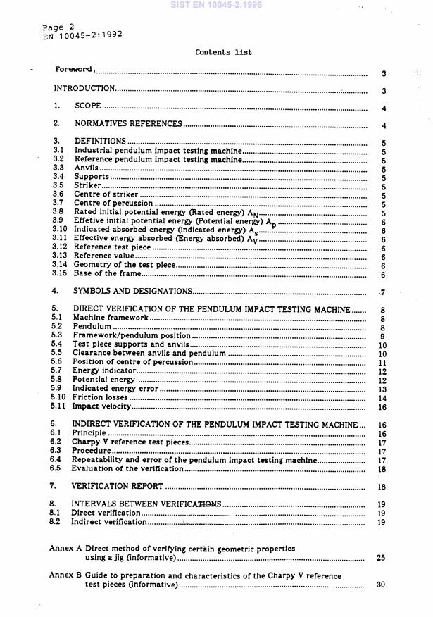 EN 10045-2:1992 is a standard published by the European Committee for Standardization (CEN). Its full title is "Metallic materials - Charpy impact test - Part 2: Verification of the testing machine (pendulum impact)". This standard covers: This EN applies to the verification of (pendulum) impact testing machines used for the Charpy impact test as described in EN 10045/1. It describes two methods - The direct method allowing the physical and geometrical properties of the different parts of the testing machine to be verified stactically and seperately - The indirect method; global verification method of the pendulum impact testing machine using Charpy V reference test pieces as specifies in 6.2.