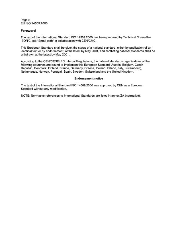 EN ISO 14509:2000 is a standard published by the European Committee for Standardization (CEN). Its full title is "Small craft - Measurement of airborne sound emitted by powered recreational craft (ISO 14509:2000)". This standard covers: Diese Internationale Norm legt die Bedingungen für reproduzierbare und vergleichbare Messungen des maximalen Schalldruckpegels fest, der während der Vorbeifahrt von motorgetriebenen Sportbooten von bis zu 24 m Länge erzeugt wird. Eingeschlossen sind Boote mit Einbaumotor, Boote mit Z-Antrieb, Wasserskooter und Außenbordmotoren in Verbindung mit einem Normboot. In Anhang A ist ein Verfahren beschrieben, nach welchem der Schallexpositionspegel zu messen ist, falls dessen Bestimmung zusätzlich zum maximalen Schalldruckpegel gewünscht ist. ANMERKUNG Für Schallemissionsmessungen an anderen als den oben beschriebenen Booten ist ISO 2922 anzuwenden. Das in dieser Internationalen Norm beschriebene akustische Messverfahren ist von der Genauigkeitsklas-se "Laborverfahren" (Genauigkeitsklasse 2), die in ISO 12001 definiert ist. Siehe auch Abschnitt 6.