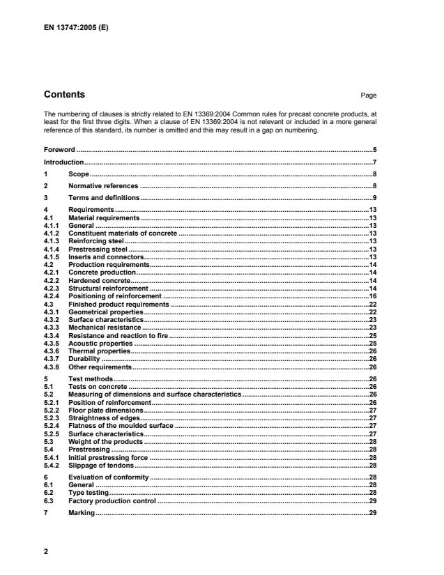 EN 13747:2005 is a standard published by the European Committee for Standardization (CEN). Its full title is "Precast concrete products - Floor plates for floor systems". This standard covers: This European standard deals with the requirements, the basic performance criteria and evaluation of conformity for precast floor plates made of reinforced or prestressed normal weight concrete according to EN 1992 1 1:2004, used in conjunction with cast-in-situ concrete (topping) for the construction of composite floor slabs. Annex B gives different types of composite slabs made with floor plates. These floor plates, with or without void formers, can include lattice girders or stiffening ribs incorporated during the precasting. They shall be manufactured in factories by casting, slip forming or extrusion. The products covered by this standard are intended to be used as part of structural floors in applications such as: - floors and roofs of buildings (including industrial and storage buildings, public buildings as schools, hospitals, etc.); - parking/circulation areas; - cover for culverts; - etc. The products may be used in seismic areas provided they fulfil the requirements specific to this use. This standard does not cover: - reinforced floor plates with a nominal thickness less than 40 mm; - prestressed floor plates with a nominal thickness less than 50 mm; - floor plates with a very smooth upper face, such as defined in 6.2.5 of EN 1992-1-1:2004.