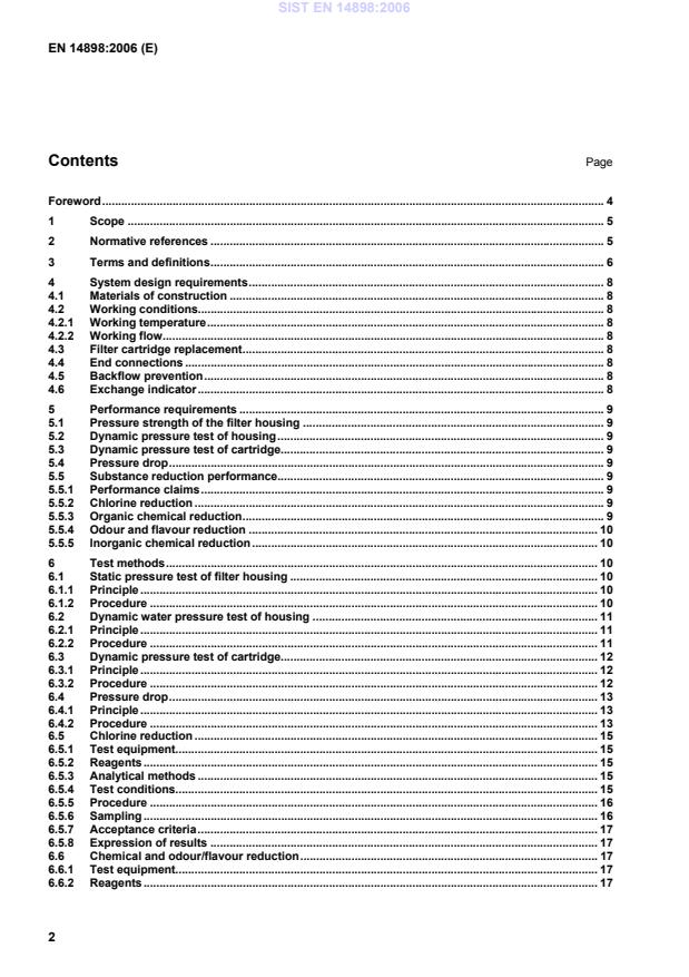NOTE The protocols specified in 6.6 of this standard can be adapted to test the reduction of substances not specifically covered by the performance requirements of this standard (see Annex C). Claims for the reduction of such substances are clearly separated from the claims made of conformity to this standard (see also 7.1). 6 Test methods 6.1 Static pressure test of filter housing 6.1.1 Principle The filter is mounted in a test rig and a water pressure 1.5 times the maximum working pressure is applied for 10 min. The filter is examined