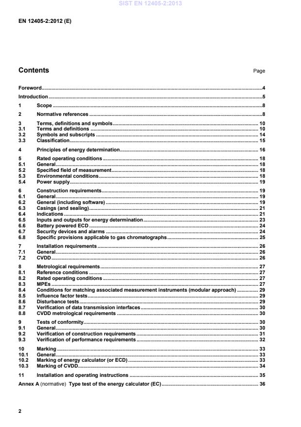 Contents Page Foreword .4Introduction .51Scope .82Normative references .83Terms, definitions and symbols . 103.1Terms and definitions . 103.2Symbols and subscripts . 143.3Classification . 154Principles of energy determination. 165Rated operating conditions . 185.1General . 185.2Specified field of measurement . 185.3Environmental conditions . 185.4Power supply . 196Construction requirements . 196.1General . 196.2General (including software) . 196.3Casings (and sealing) . 216.4Indications . 216.5Inputs and outputs for energy determination . 236.6Battery powered ECD . 246.7Security devices and alarms . 246.8Specific provisions applicable to gas chromatographs . 257Installation requirements . 267.1General . 267.2CVDD . 268Metrological requirements . 278.1Reference conditions . 278.2Rated operating conditions . 278.3MPEs . 278.4Conditions for matching associated measurement instruments (modular approach) . 298.5Influence factor tests . 298.6Disturbance tests . 298.7Verification of data transmission interfaces . 308.8CVDD metrological requirements . 309Tests of conformity. 309.1General . 309.2Verification of construction requirements . 319.3Verification of performance requirements . 3210Marking . 3310.1General . 3310.2Marking of energy calculator (or ECD) . 3310.3Marking of CVDD. 3411Installation and operating instructions . 35Annex A (normative)