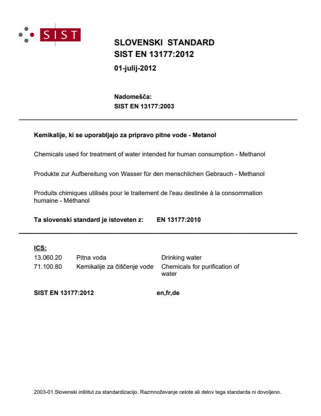 2003-01.Slovenski inštitut za standardizacijo. Razmnoževanje celote ali delov tega standarda ni dovoljeno.Kemikalije, ki se uporabljajo za pripravo pitne vode - MetanolProdukte zur Aufbereitung von Wasser für den menschlichen Gebrauch - MethanolProduits chimiques utilisés pour le traitement de l'eau destinée à la consommation humaine - MéthanolChemicals used for treatment of water intended for human consumption - Methanol71.100.80Chemicals for purification of water13.060.20Pitna vodaDrinking waterICS:Ta slovenski standard je istoveten z:EN 13177:2010SIST EN 13177:2012en,fr,de01-julij-2012SIST EN 13177:2012SLOVENSKI