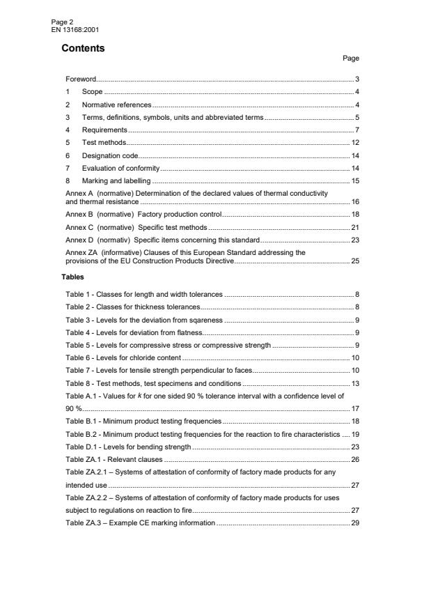 Page 2EN 13168:2001ContentsPageForeword.31Scope.42Normative references.43Terms, definitions, symbols, units and abbreviated terms.54Requirements.75Test methods.126Designation code.147Evaluation of conformity.148Marking and labelling.15Annex A
