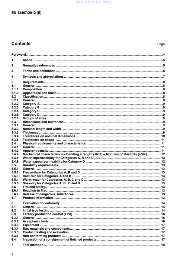 5.1.1 Composition Sheets shall consist essentially of cement or a calcium silicate formed by a chemical reaction of a siliceous and a calcareous material, reinforced by fibres. The cement shall comply with EN 197-1 or with technical specifications relevant in the country of use. This European Standard covers fibre-reinforced cement flat sheets of type NT. The reinforcing fibres shall be one or more of the following forms: discrete elements randomly dispersed; continuous strands or tapes; nets or webs. Process aids, fillers, aggregates and pigments may be added. 5.1.2 Appearance and finish The exposed face of the sheets can be with or without texture. The sheets can be coloured or left in their natural colour. The sheets can also receive adherent coloured or uncoloured coatings on their surface. Variations of the surface appearance which do not impair the fitness for purpose of the sheets are permitted. The sheets may be supplied with holes for fixing and/or cut to size. 5.2 Classification 5.2.1 General Sheets covered by this document are divided into: four categories in accordance with their weather resistance (see 5.2.2 to 5.2.5); five classes in accordance with their bending strength (see 5.4.3); two groups of sizes in accordance with their method of installation (see 5.2.6); two levels in accordance with their dimensional tolerances (see 5.3.4). Type tests for each category are specified in Table 7. SIST EN 12467:2013
