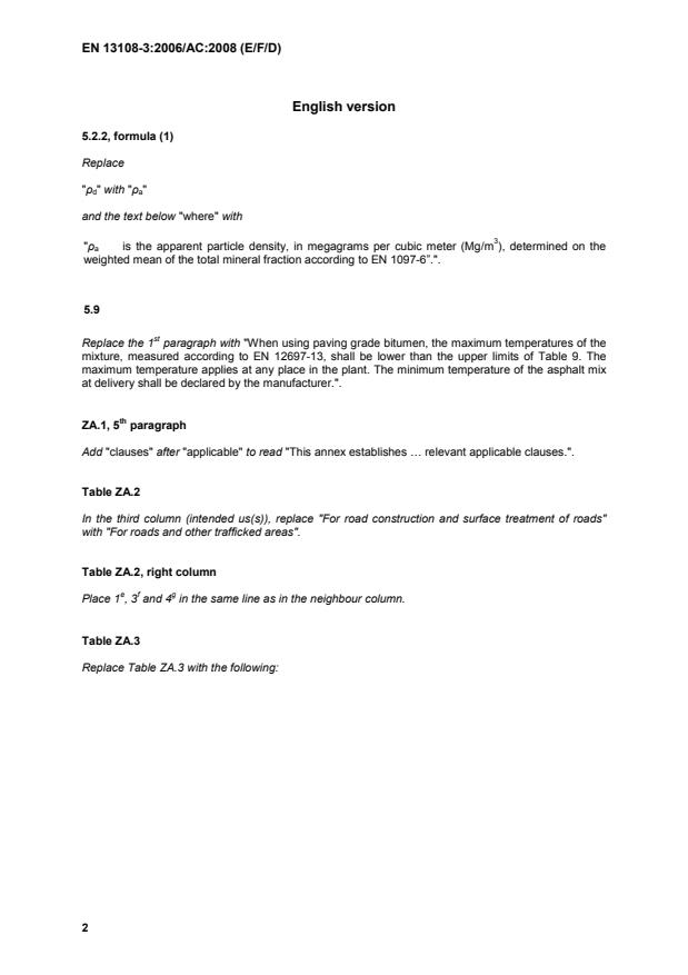 EN 13108-3:2006/AC:2008 is a corrigendum published by the European Committee for Standardization (CEN). Its full title is "Bituminous mixtures - Material specifications - Part 3: Soft Asphalt". This standard covers: 20070228 - Pending TC response - Problems with corr. content TC - Technical corrections in 5.9, ZA.2.2, Tables ZA.3a and ZA.3b and additional editorial corrections