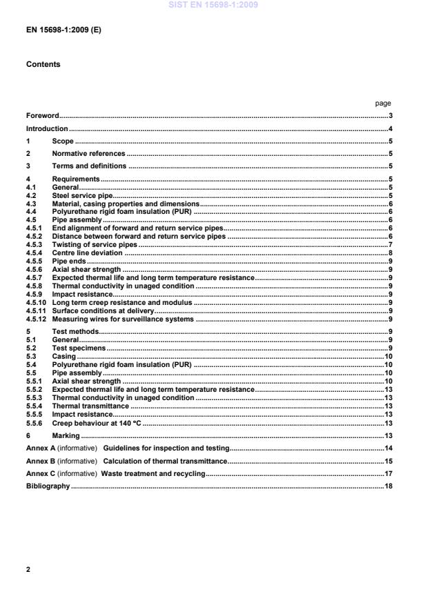 EN 15698-1:2009 is a standard published by the European Committee for Standardization (CEN). Its full title is "District heating pipes - Preinsulated bonded twin pipe systems for directly buried hot water networks - Part 1: Twin pipe assembly of steel service pipe, polyurethane thermal insulation and outer casing of polyethylene". This standard covers: This European Standard for District Heating Twin Pipes, specifies requirements and test methods for straight lengths of prefabricated thermally insulated pipe-in-pipe assemblies for directly buried hot water networks, comprising two steel service pipes from DN 15 to DN 250, rigid polyurethane foam insulation and one cylindrical outer casing of polyethylene. The pipe assembly may also include the following additional elements: Measuring wires, spacers and diffusion barriers. This standard applies only to insulated twin pipe assemblies, for continuous operation with hot water at various temperatures up to 120 °C and occasionally with a peak temperature up to 140 °C. The estimation of expected thermal life with continuous operation at various temperatures is outlined in Annex B of EN 253:2003.