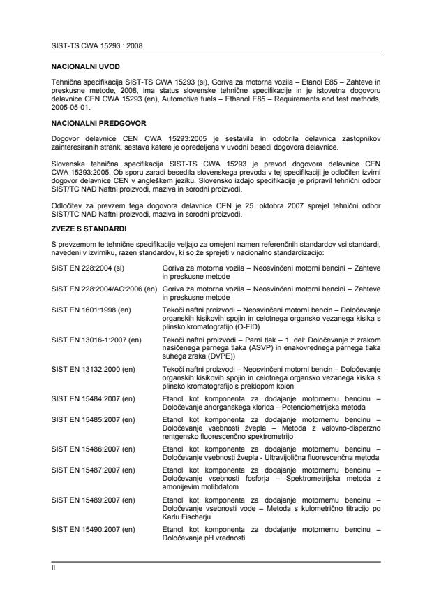 II NACIONALNI UVOD Tehnična specifikacija SIST-TS CWA 15293 (sl), Goriva za motorna vozila – Etanol E85 – Zahteve in preskusne metode, 2008, ima status slovenske tehnične specifikacije in je istovetna dogovoru delavnice CEN CWA 15293 (en), Automotive fuels – Ethanol E85 – Requirements and test methods, 2005-05-01. NACIONALNI PREDGOVOR