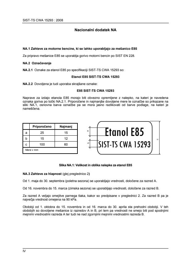 Dovoljena je tudi uporaba skrajšane oznake: E85 SIST-TS CWA 15293 Naprave za izdajo etanola E85 morajo biti obvezno opremljene z nalepko, na kateri je navedena oznaka goriva po točki NA.2.1. Priporočene in najmanjše dovoljene mere te označbe so prikazane na sliki NA.1, osnovna barva označbe pa se mora jasno razlikovati od barve podlage, na kateri je nameščena.