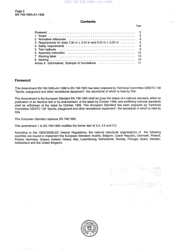 EN 748:1995 + A1:1998 is a standard published by the European Committee for Standardization (CEN). Its full title is "Playing field equipment - Football goals - Functional and safety requirements, test methods (including amendment 1:1998)". This standard covers: Migrated from Progress Sheet (TC Comment) (2000-07-10): Shortened UAP of 4 months (CC/970827)