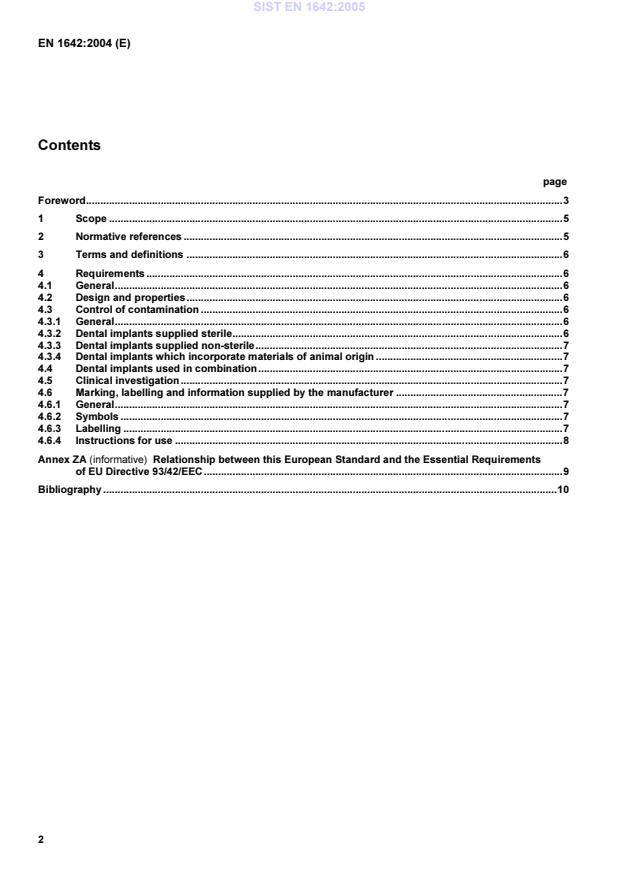 EN 1642:2004 is a standard published by the European Committee for Standardization (CEN). Its full title is "Dentistry - Medical devices for dentistry - Dental implants". This standard covers: This European Standard specifies general requirements for dental implants. Surgically implantable dental materials defined as restorative materials are specifically excluded and described in EN 1641. This European Standard includes requirements for intended performance, design attributes, components, sterilization, packaging, marking, labelling, and information supplied by the manufacturer.