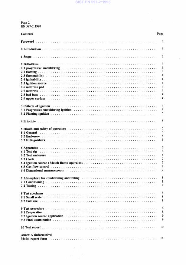 EN 597-2:1994 is a standard published by the European Committee for Standardization (CEN). Its full title is "Furniture - Assessment of the ignitability of mattresses and upholstered bed bases - Part 2: Ignition source: Match flame equivalent". This standard covers: This standard lays down a test method to assess the ignitability of mattresses, upholstered bed bases or mattress pads, when subjected to a gas flame equivalentto a match flame. Air mattresses and water beds are excluded from this standard.