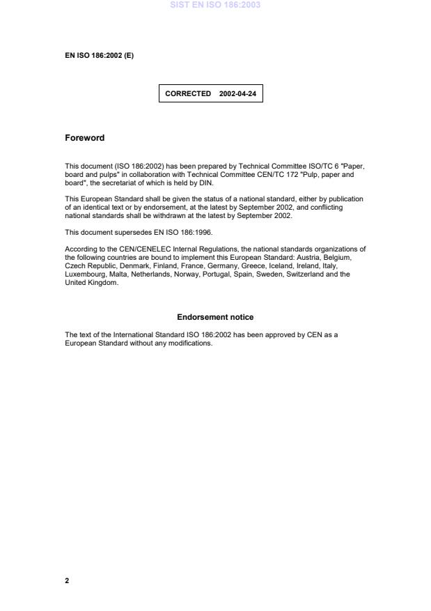 ISO 186 was prepared by Technical Committee ISO/TC 6, Paper, board and pulps, Subcommittee SC 2, Test