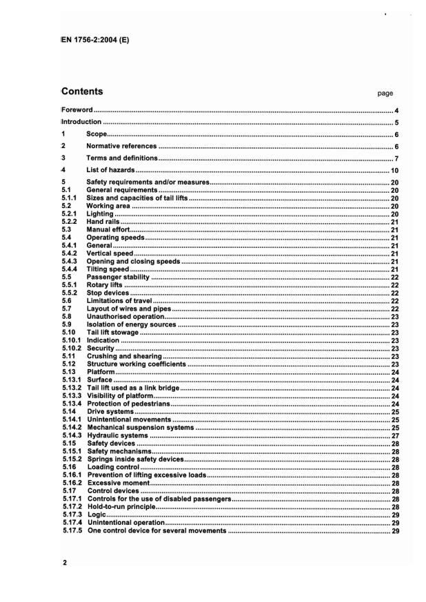 EN 1756-2:2004 is a standard published by the European Committee for Standardization (CEN). Its full title is "Tail lifts - Platform lifts for mounting on wheeled vehicles - Safety requirements - Part 2: Tail lifts for passengers". This standard covers: Part 2 of standard EN 1756 specifies safety requirements for design of tail lifts as defined in 3.1 for mounting on wheeled passenger vehicles. Vehicles for the loading of disabled passengers onto aircraft and ships are included within the scope of the standard (although dock-mounted lifts are excluded). It also specifies the verification of such tail lifts and the safety information that shall be provided for their use. This document deals with the technical requirements to minimise the hazards listed in clause 4 which can arise during the operation of tail lifts when carried out in accordance with the specifications as intended by the manufacturer or his authorised representative. It applies to passenger tail lifts: - used for the purpose of embarking and/or disembarking passengers to and from such vehicles; - intended to be fitted, temporarily or permanently, either inside or on the front, side or rear of the wheeled vehicle; - driven either by hand or by electric power; - equipped with a platform to support passengers who may be pedestrians or riders in wheelchairs and may be accompanied by an attendant. Embarking and/or disembarking operations include the use of a tail lift to lift and/or lower passengers, and if specifically approved by the manufacturer, for use as a link bridge. The standard covers the significant hazards which could occur when a tail lift is used as intended and under the conditions foreseen by the manufacturer. A list of significant hazards is given in clause 4. This document is not applicable to tail lifts which are manufactured before the date of publication of this document by CEN.