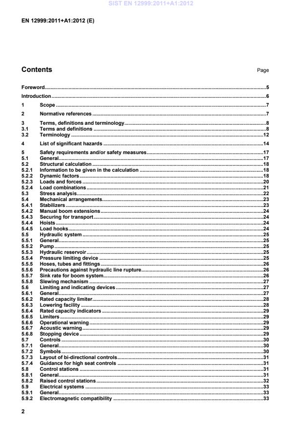 The hazards covered by this standard are identified in Clause 4. This European Standard does not cover hazards related to the lifting of persons. This European Standard is not applicable to loader cranes which are manufactured before the date of its publication as EN. NOTE The use of cranes for lifting of persons can be subject to specific national regulations. 2 Normative references !The following documents, in whole or in part, are normatively referenced in this document and are indispensable for its application. For dated references, only the edition cited applies. For undated references, the latest edition of the referenced document (including any amendments) applies." EN 349:1993+A1:2008, Safety of machinery — Minimum gaps to avoid crushing of parts of the human body EN 12077-2:1998+A1:2008, Cranes safety — Requirements for health and safety — Part 2: Limiting and indicating devices EN 14492-2:2006+A1:2009, Cranes — Power driven winches and hoists — Part 2: Power driven hoists EN 12644-1:2001+A1:2008, Cranes – Information for use and testing — Part 1: Instructions EN 12644-2:2000+A1:2008, Cranes — Information for use and testing — Part 2: Marking EN 13001-1:2004+A1:2009, Cranes — General design — Part 1: General principles and requirements EN 13001-2:2004+A3:2009, Cranes safety — General design — Part 2: Load effects prEN 13001-3-1:2010, Cranes — General design — Part 3-1: Limit states and proof competence of steel structure EN 13557:2003+A2:2008, Cranes — Controls and control stations EN 13586:2004+A1:2008, Cranes — Access EN 61000-6-2:2005, Electromagnetic compatibility (EMC) — Part 6-2: Generic standards — Immunity for industrial environments (IEC 61000-6-2:2005) EN 61000-6-4:2007, Electromagnetic compatibility (EMC) — Part 6-4: Generic standards — Emission standard for industrial environments (IEC 61000-6-4:2006) EN 60204-32:2008, Safety of machinery — Electrical equipment of machines — Part 32: Requirements for hoisting machines (IEC 60204-32:2008) EN 954-1:1996, Safety of machinery — Safety related parts of control systems — Part 1: General principles for design SIST EN 12999:2011+A1:2012