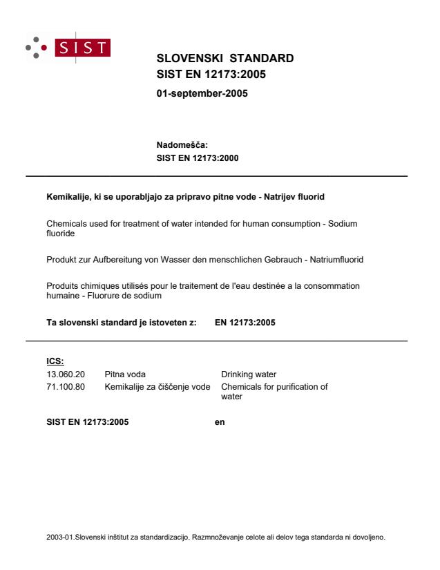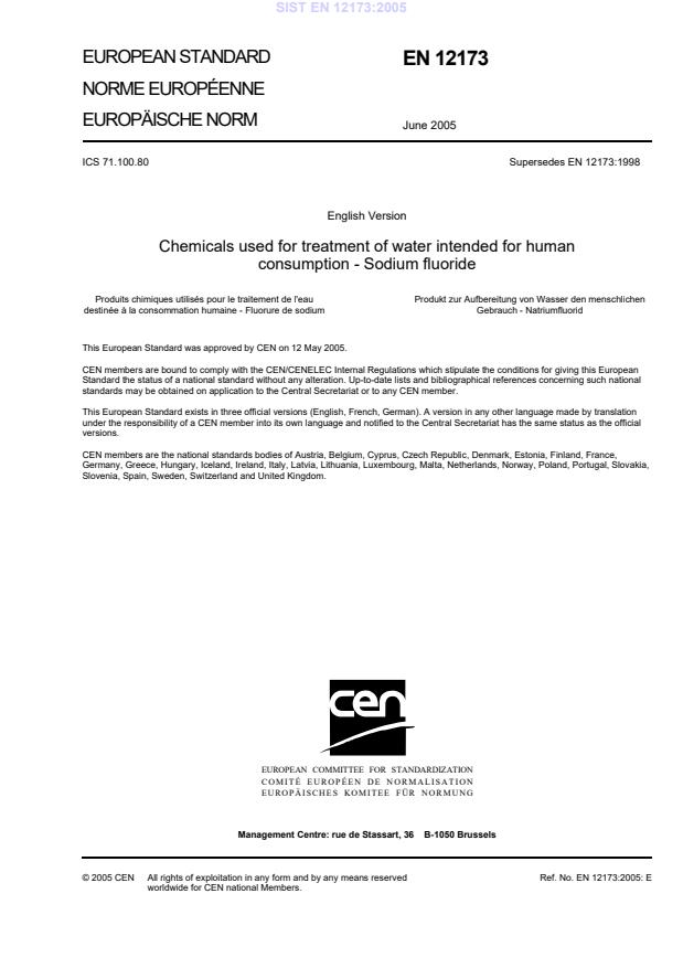 EN 12173:2005 is a standard published by the European Committee for Standardization (CEN). Its full title is "Chemicals used for treatment of water intended for human consumption - Sodium fluoride". This standard covers: This European Standard is applicable to sodium fluoride used for treatment of water intended for human consumption. It describes the characteristics of sodium fluoride and specifies the requirements and the corresponding test methods for sodium fluoride. It gives information on its use in water treatment. It also determines the rules relating to safe handling and use (see Annex B).