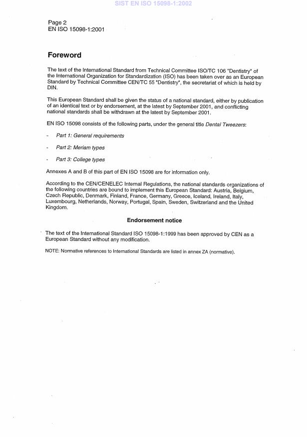 Dental tweezers - Part 1: General requirements (ISO 15098-1:2000)