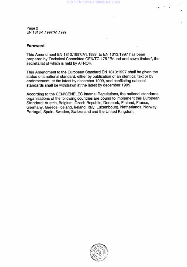 EN 1313-1:1997/A1:1999 is a amendment published by the European Committee for Standardization (CEN). Its full title is "Round and sawn timber - Permitted deviations and preferred sizes - Part 1: Softwood sawn timber". This standard covers: This European standard specifies permitted deviations and preferred sizes of European softwood sawn timber at a moisture content of 20%.