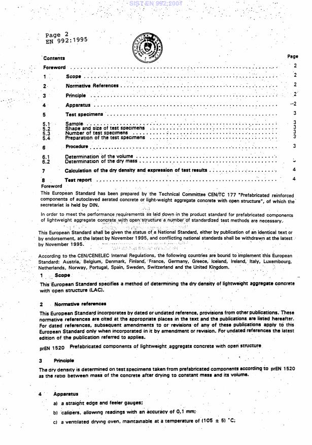 EN 992:1995 is a standard published by the European Committee for Standardization (CEN). Its full title is "Determination of the dry density of lightweight aggregate concrete with open structure". This standard covers: This European standard specifies a method of fetermining the dry density of lightweight aggregate concrete with open structure (LAC).