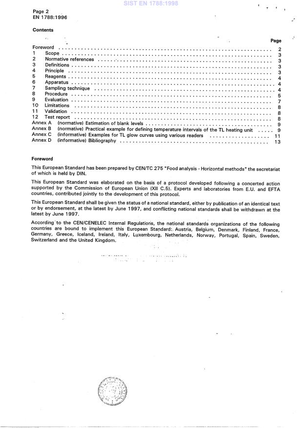 EN 1788:1996 is a standard published by the European Committee for Standardization (CEN). Its full title is "Foodstuffs - Detection of irradiated food from which silicate minerals can be isolated - Method by thermoluminescence". This standard covers: This draft European Standard specifies a method of detecting whether food has been treated by ionizing radiation by thermoluminescence analysis of contaminating silicate minerals. The method is applicable to those foodstuffs from which a sufficient amount of silicate minerals can be isolated. The method has been successfully tested in interlaboratory tests with herbs and spices and their mixtures (1) to (3) and shrimps (4) et (5).