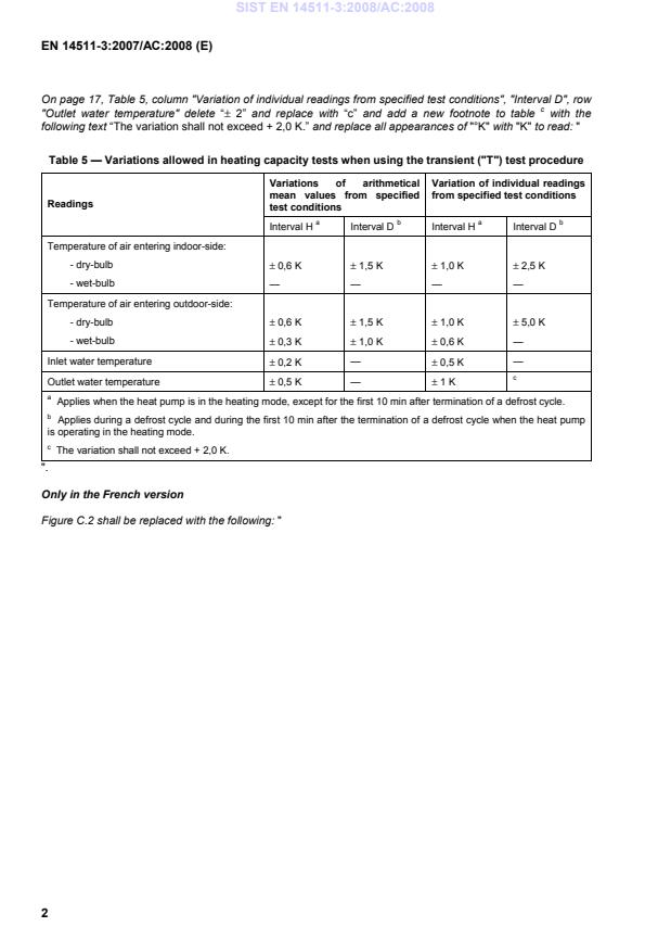 TC - Correction of value in Table 5, last column, row "Outlet water temperature", addition of footnote to table c and correction of unit Kelvin AFNOR - Correction of Figure C.2
