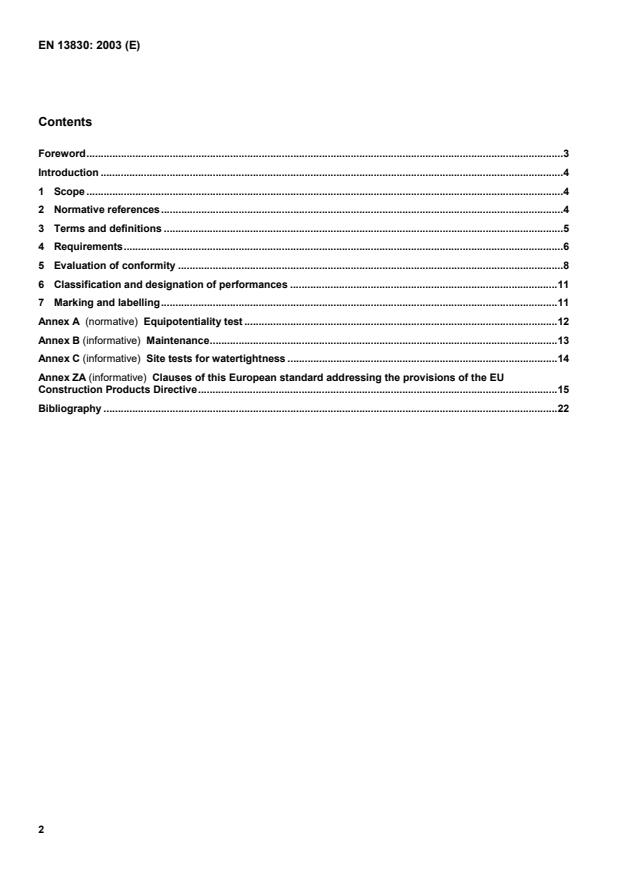 EN 13830: 2003 (E)2ContentsForeword.3Introduction.41Scope.42Normative references.43Terms and definitions.54Requirements.65Evaluation of conformity.86Classification and designation of performances.117Marking and labelling.11Annex A