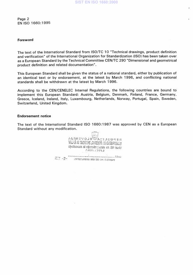 EN ISO 1660:1995 is a standard published by the European Committee for Standardization (CEN). Its full title is "Technical drawings - Dimensioning and tolerancing of profiles (ISO 1660:1987)". This standard covers: This second edition constitutes a technical revision of the first one. The methods described are applicable to profiled outlines and profiled surfaces and are related to the sub-clauses in ISO 1101 dealing with the "profile tolerance of a line" and "profile tolerance of a surface