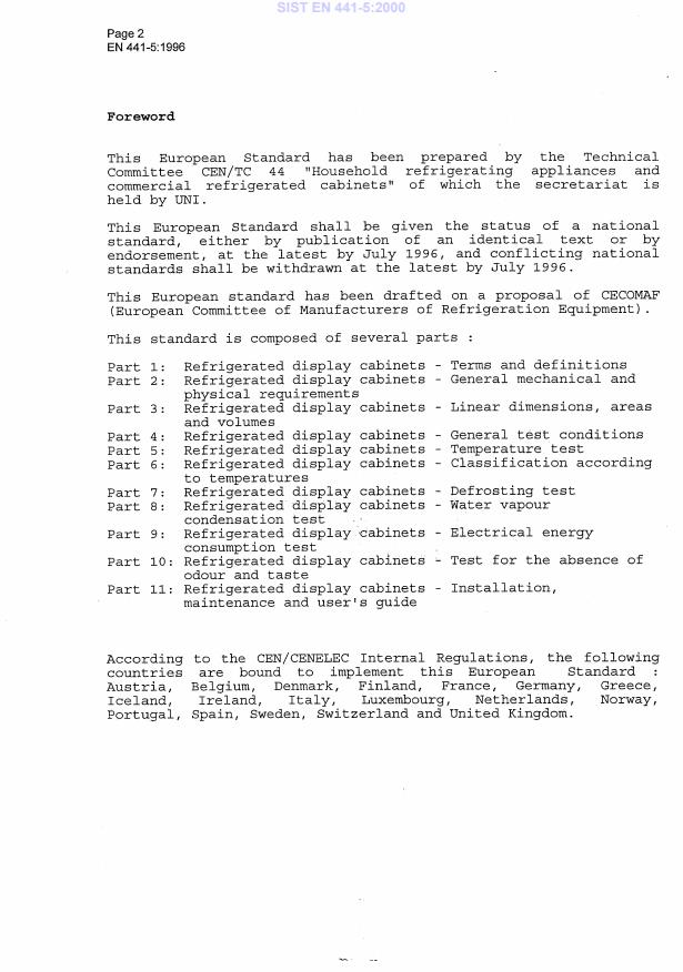 EN 441-5:1996 is a standard published by the European Committee for Standardization (CEN). Its full title is "Refrigerated display cabinets - Part 5: Temperature test". This standard covers: This standard specifies terminology, general mechanical and physical requirements, test conditions as well as installation, maintenance and user's guide for refrigerated display cabinets for the sale and/or display of food products. This standard does not cover refrigerated vending machines or cabinets intended for use in catering or similar non retail applications. This part of EN 441 specifies methods for the determination of test package temperatures in refrigerated display cabinets.