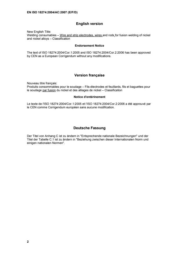 EN ISO 18274:2004/AC:2007 is a corrigendum published by the European Committee for Standardization (CEN). Its full title is "Welding consumables - Wire and strip electrodes, wires and rods for fusion welding of nickel and nickel alloys - Classification (ISO 18274:2004/Cor.1:2005 and Cor.2:2006)". This standard covers: ISO - Taking over of a ISO Technical Corrigendum
