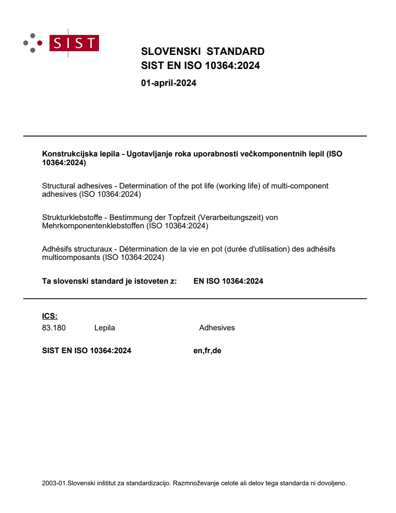Konstrukcijska lepila - Ugotavljanje roka uporabnosti večkomponentnih lepil (ISO 10364:2024)