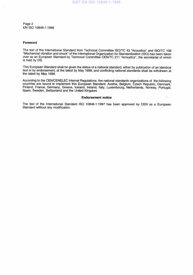 © ISOISO 10846-1:1997(E)iiiIntroductionPassive vibration isolators of various kinds are used to reduce the transmission of vibrations. Examples are automobileengine mounts, elastic supports for buildings, elastic mounts and flexible shaft couplings for shipboard machinery andsmall isolators in household appliances.This part of ISO 10846 serves as an introduction and a guide to parts 2 to 5 of ISO 10846, which describelaboratory measurement methods for the determination of the most important quantities which govern thetransmission of vibrations through linear isolators, i.e. frequency-dependent dynamic stiffnesses.This part of ISO 10846 provides the theoretical background, the principles of the methods, the limitations of themethods and guidance for the selection of the most appropriate standard of the series.The laboratory conditions described in all parts of ISO 10846 include the application of static preload.The results of the methods are useful for isolators which are used to prevent low-frequency vibration problems and toattenuate structure-borne sound. The methods are not sufficiently appropriate to characterize completely isolatorswhich are used to attenuate shock excursions.SIST EN ISO 10846-1:1999