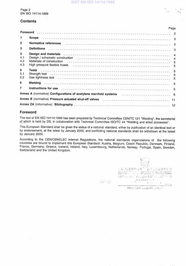 EN ISO 14114:1999 is a standard published by the European Committee for Standardization (CEN). Its full title is "Gas welding equipment - Acetylene manifold systems for welding, cutting and allied processes - General requirements (ISO 14114:1999)". This standard covers: This standard is applicable to acetylene cylinder manifold systems extending from the cylinder value or the bundle outlet connections to the connection of the flame arrestor. It specifies requirements for design, materials and testing of cylinder manifold systems for the supply of acetylene for use in welding, cutting and allied processes.