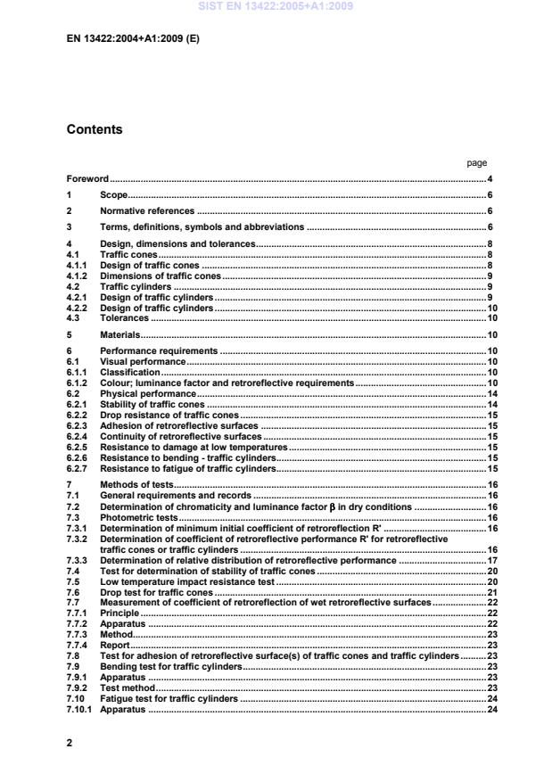 6.2.2 Drop resistance of traffic cones Traffic cones shall satisfy the tests described in 7.6. 6.2.3 Adhesion of retroreflective surfaces Retroreflective materials applied to traffic cones and traffic cylinders shall satisfy the tests described in 7.8. 6.2.4 Continuity of retroreflective surfaces Where technical considerations require breaks in retroreflective surfaces, such breaks in the case of Category A traffic cones and traffic cylinders shall not exceed 5 mm in width for breaks in the vertical axis and 2 mm in the horizontal axis, and in the case of Category B traffic cones and traffic cylinders 10 mm in the vertical axis and 6 mm in the horizontal axis. 6.2.5 Resistance to damage at low temperatures Traffic cones and traffic cylinders shall satisfy the tests described in 7.5. During this test, no part of the cone body or cylinder body or retroreflective surface material shall tear, break or be destroyed. The traffic cone body or cylinder body shall recover its original form after the impact. After the impact the R (CIL) of the retroreflective area(s) shall be no lower than 80 % of the original R (CIL).value(s). All deviations from the requirements shall be listed in the report together with the percentage(s) of the coefficient of retroreflection change(s) resulting from the impact(s). 6.2.6 Resistance to bending - traffic cylinders When tested in accordance with 7.9 traffic cylinders shall not crack, fracture or split and the traffic cylinder shall return to its nominal shape within 1 min of completion of test. 6.2.7 Resistance to fatigue of traffic cylinders When tested in accordance with 7.10 traffic cylinders shall not crack, fracture or split and the traffic cylinder shall return to its nominal shape within 1 minute of completion of test. A residual deflection at the top of the traffic cylinder, measured in any horizontal direction shall not exceed 7 % H. SIST EN 13422:2005+A1:2009