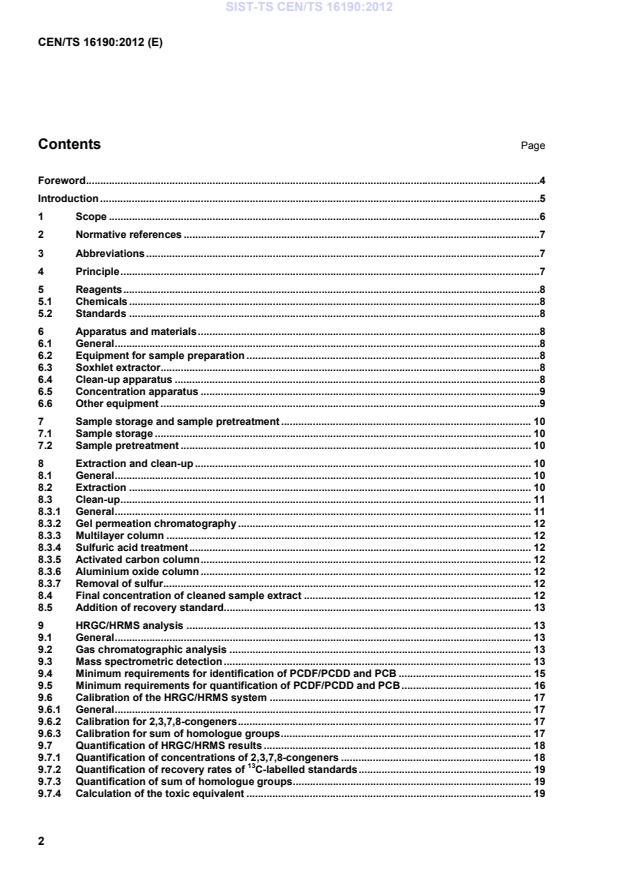 CEN/TS 16190:2012 is a technical specification published by the European Committee for Standardization (CEN). Its full title is "Sludge, treated biowaste and soil - Determination of dioxins and furans and dioxin-like polychlorinated biphenyls by gas chromatography with high resolution mass selective detection (HR GC-MS)". This standard covers: This Technical Specification specifies a method for quantitative determination of 17 2,3,7,8-chlorine substituted dibenzo-p-dioxins and dibenzofurans and dioxin-like polychlorinated biphenyls in sludge, treated biowaste and soil using liquid column chromatographic clean-up methods and GC/HRMS. The analytes to be determined with this Technical Specification are listed in Table 2. (...) The limit of detection depends on the kind of sample, the congener, the equipment used and the quality of chemicals used for extraction and clean-up. Under the conditions specified in this Technical Specification, limits of detection better than 1 ng/kg (expressed as dry matter) can be achieved. This method is "performance based". It is permitted to modify the method if all performance criteria given in this method are met. NOTE In principle this method can also be applied for sediments, mineral wastes and for vegetation. It is the responsibility of the user of this Technical Specification to validate the application for these matrices.