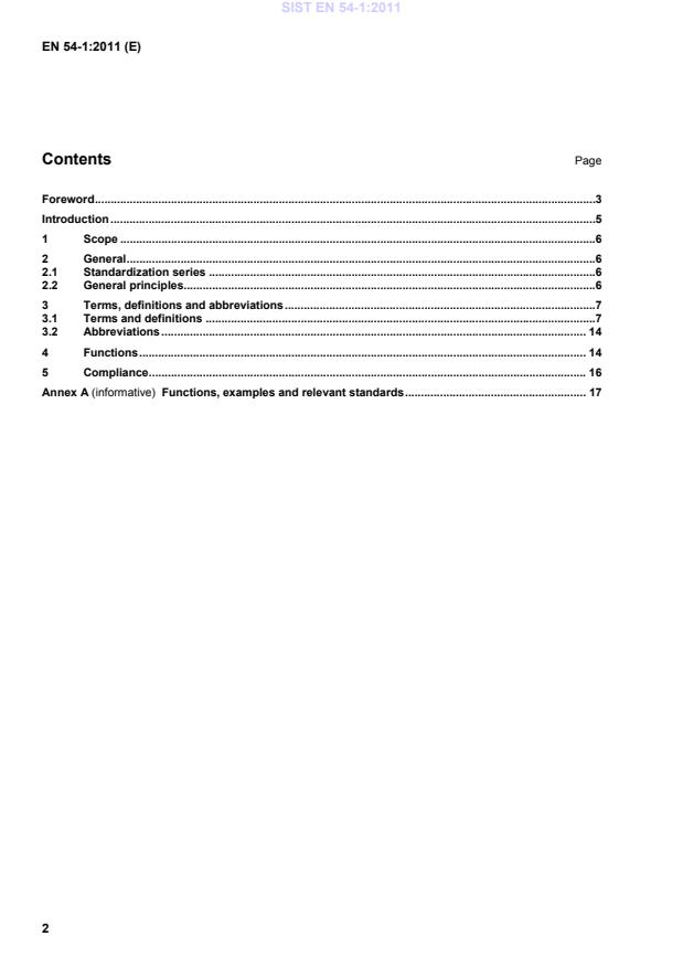 Ta del EN 54 določa izraze in definicije, ki se uporabljajo v celotnem EN 54. Podaja načela, na katerih je bil utemeljen vsak del standarda, in opisuje funkcije, ki jih izvajajo komponente sistema za odkrivanje in javljanje požara. Ta evropski standard velja za sisteme za odkrivanje in javljanje požara v zgradbah in okoli njih. Ta evropski standard podaja potrebne informacije o predvideni uporabi standardov serije EN 54. Serija EN 54 velja za sisteme za odkrivanje in javljanje požara v zgradbah in okoli njih, sestavljene iz več komponent, povezanih za zaznavo požara ob najzgodnejšem praktičnem trenutku, in zagotavlja: - lokalne in/ali oddaljene požarne alarme organizacijam, ki so pooblaščene, da skrbijo za zgradbe in njihovo okolje; - signale, ki ob požaru sprožijo delovanje druge opreme/sistemov za zaščito pred ognjem. Serija EN 54 se lahko uporablja tudi drugje, npr. za rudnike in ladje, vendar je treba pred uporabo upoštevati določeno naravo vsake aplikacije. Lahko so potrebni dodatni zmogljivostni in okoljski preskusi. To ne izključuje proizvodnje ali uporabe sistemov, ki imajo posebne značilnosti, primerne za zaščito pred nekaterimi tveganji pred določenimi nevarnostmi.