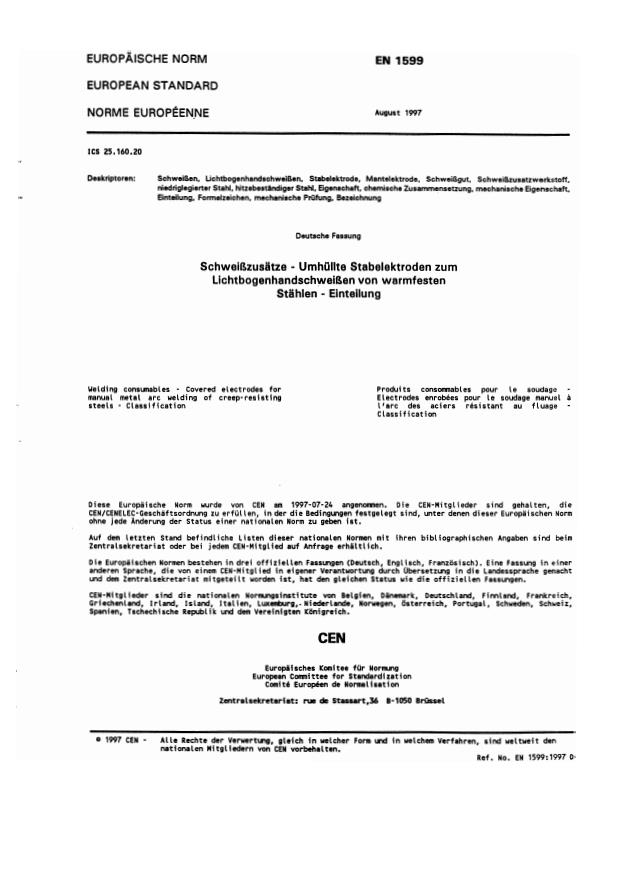 EN 1599:1997 is a standard published by the European Committee for Standardization (CEN). Its full title is "Welding consumables - Covered electrodes for manual arc welding of creep-resisting steels - Classification". This standard covers: This standard specifies requirements for classification of covered electrodes based on the all-weld metal in the as welded or heat treated conditions for manual metal arc welding of ferritic and martensitic creep-resisting and low alloy elevated temperature steels.