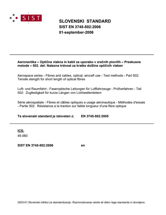 2003-01.Slovenski inštitut za standardizacijo. Razmnoževanje celote ali delov tega standarda ni dovoljeno.Aerospace series - Fibres and cables, optical, aircraft use - Test methods - Part 502: Tensile stength for short length of optical fibresNHQSérie aérospatiale - Fibres et câbles optiques a usage aéronautique - Méthodes d'essais - Partie 502: