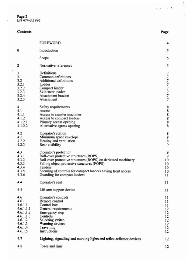 EN 474-3:1996 is a standard published by the European Committee for Standardization (CEN). Its full title is "Earth-moving machinery - Safety - Part 3: Requirements for loaders". This standard covers: This standard specifies additional requirements and/or exceptions from EN 474-1:1994 'Earth-moving machinery - Safety - Part 1: General requirements'. This standard applies to wheel and crawler loaders defined in ISO/DIS 6165:1994, and gives additional requirements for attachments and for derivated machinery. This standard applies also for compact loaders as defined in 3.2.2 and figure B.2. This standard deals with the significant hazards pertinent to loaders when they are used as intended and under the conditions foreseen by the manufacturer (see Annex A of this standard and Annex C of EN 474-1:1994). Telescopic loaders are not covered in EN 474.