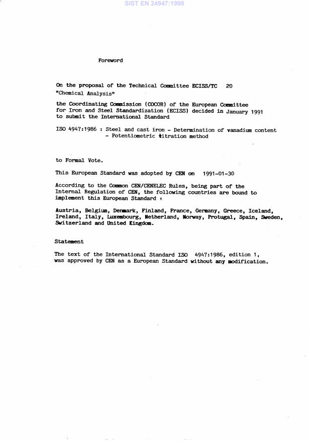 Steel and cast iron - Determination of vanadium content - Potentiometric titration method (ISO 4947:1986)