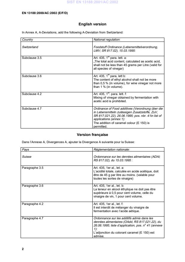 EN 13188:2000/AC:2002 is a corrigendum published by the European Committee for Standardization (CEN). Its full title is "Vinegar - Product made from liquids of agricultural origin - Definitions, requirements, marking". This standard covers: TC - A Deviation