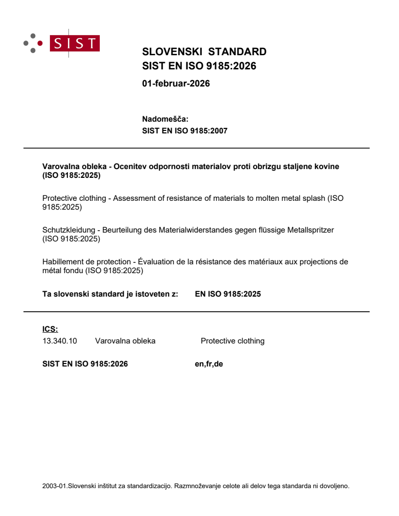 Varovalna obleka - Ocenitev odpornosti materialov proti obrizgu staljene kovine (ISO 9185:2025)