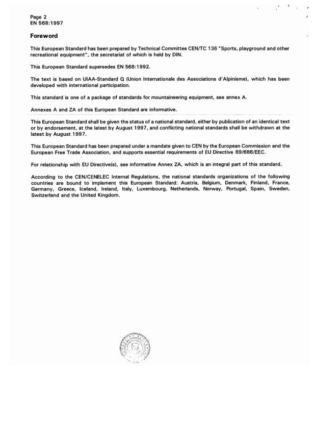 EN 568:2007 - Mountaineering equipment - Ice anchors - Safety requirements and test methods - Effective Date