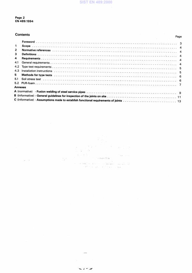EN 489:1994 is a standard published by the European Committee for Standardization (CEN). Its full title is "Preinsulated bonded pipe systems for underground hot water networks - Joint assembly for steel service pipes, polyurethane thermal insulation and outer casing of polyethylene". This standard covers: This standard specifies requirements for joints, made under field conditions, between adjacent preinsulated pipes and/or fittings in district heating networks. The standard covers jointing of steel service pipes by means of fusion welding, the connection of casing pipe ends and the thermal insulation with poured rigid PUR-foam.