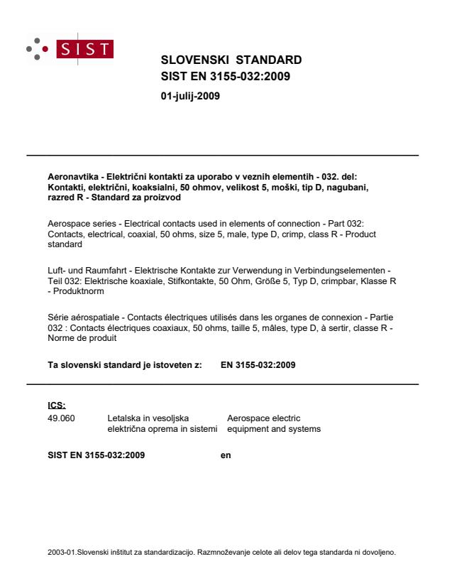 EN 3155-032:2009 is a CEN product standard in the Aerospace series that defines the required characteristics, tests and tooling for male coaxial electrical contacts, 50 ohm, size 5, type D, crimp, class R. It is intended for use with EN 3155-001 (technical specification) and EN 3155-002 (elements of connection). Associated female contacts are covered by EN 3155-033. The contacts are derived from SAE-AS39029/99 and are intermateable with SAE-AS39029/100.