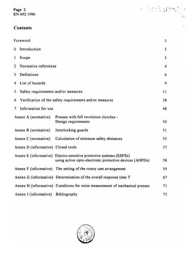 EN 692:1996 is a standard published by the European Committee for Standardization (CEN). Its full title is "Mechanical presses - Safety". This standard covers: 1.1 This standard specifies technical safety requirements and measures to be adopted by persons undertaking the design (as defined in 3.11 of EN 292-1:1991), manufacture and supply of mechanical presses which are intended to work cold metal or material partly of cold metal. 1.2 This standard also covers presses, whose primary intended use is to work cold metal, which are to be used in the same way to work other materials (such as cardboard, plastics, rubber or leather), and metal powder. 1.3 The requirements in this standard take account of intended use, as defined in 3.12 of EN 292-1:1991. This standard presumes access to the press from all directions, deals with the hazards described in clause 4, and specifies the safety measures for both the operator and other exposed persons. 1.4 This standard also applies to ancillary devices which are an integral part of the press. For the safeguarding of integrated manufacturing systems using presses, see also ISO 11161. 1.5 This standards does not cover machines whose principal designated purpose is: a) sheet metal cutting by guillotine; b) attaching a fastener, e.g. riveting, stapling or stitching; c) bending or folding; d) straightening; e) turret punch pressing; f) extruding; g) drop forging or drop stamping; h) compaction of metal powder; i) single purpose punching machines designed exclusively for profiles, e.g. for the construction industry. 1.6 This standard applies to machines built after its date of issue.
