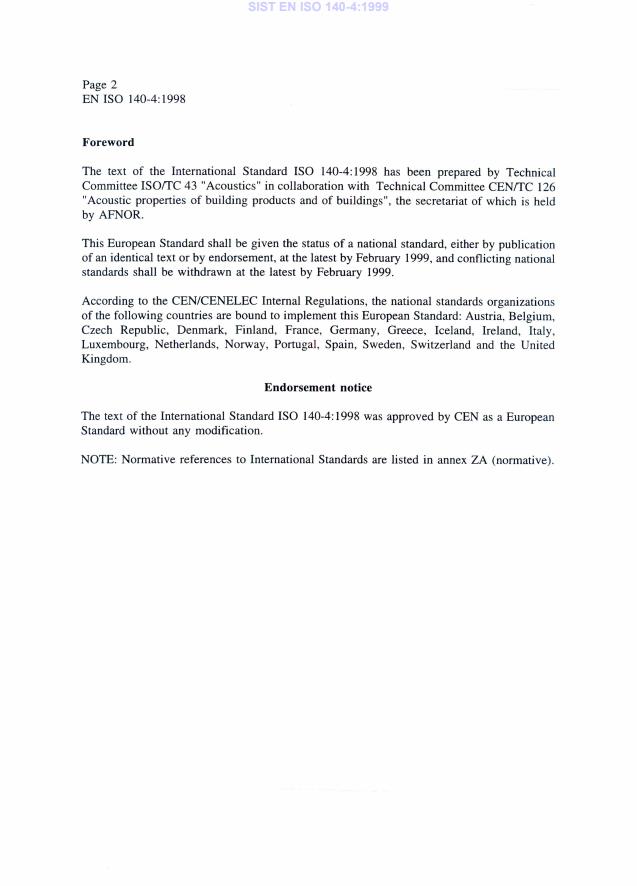 EN ISO 140-4:1998 is a standard published by the European Committee for Standardization (CEN). Its full title is "Acoustics - Measurement of sound insulation in buildings and of building elements - Part 4: Field measurements of airborne sound insulation between rooms (ISO 140-4:1998)". This standard covers: Migrated from Progress Sheet (TC Comment) (2000-07-10): EN ISO 140-1 and -3 to -8 are a package and have as DOW 1997-06-30 (BTS1 17/94) ++ DOW for EN ISO 140-1, -3 to -8 will be 1998-12-31 (2nd ext. - BTS1 C 16/1997) ++ SPP update 1997-12-11