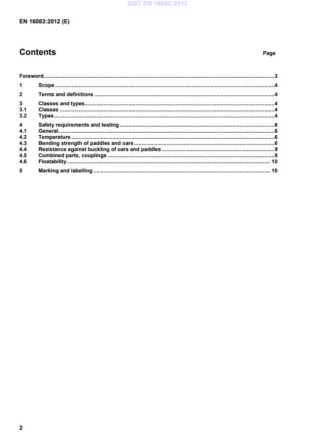 Foreword .31Scope .42Terms and definitions .43Classes and types.43.1Classes .43.2Types .44Safety requirements and testing .64.1General .64.2Temperature .64.3Bending strength of paddles and oars .64.4Resistance against buckling of oars and paddles .94.5Combined parts, couplings .94.6Floatability . 105Marking and labelling . 10 SIST EN 16083:2012