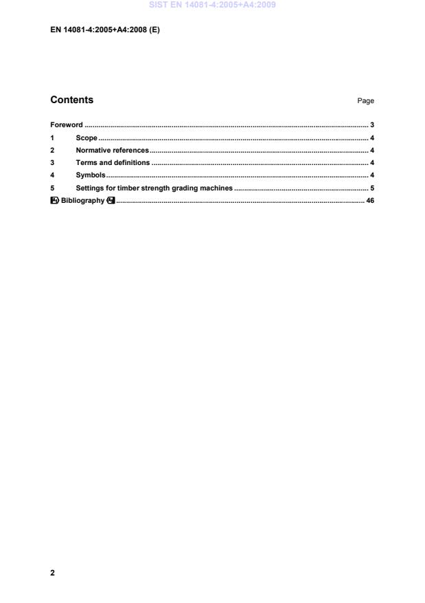 EN 14081-4:2005+A4:2008 is a standard published by the European Committee for Standardization (CEN). Its full title is "Timber structures - Strength graded structural timber with rectangular cross section - Part 4: Machine grading - Grading machine settings for machine controlled systems". This standard covers: This European Standard gives settings, derived according to the requirements given in EN 14081-2, for various combinations of strength classes or grades, grading machines and species from particular sources of growth. These settings are only applicable to timber from the sources indicated in the tables.